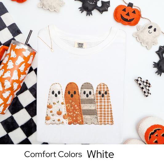 Fall Patchwork Ghost T-Shirt, Comfort Colors Halloween Tee, Autumn Ghost Shirt, Cute Spooky Season Top, Fall Graphic Clothing, Faux Embroidery