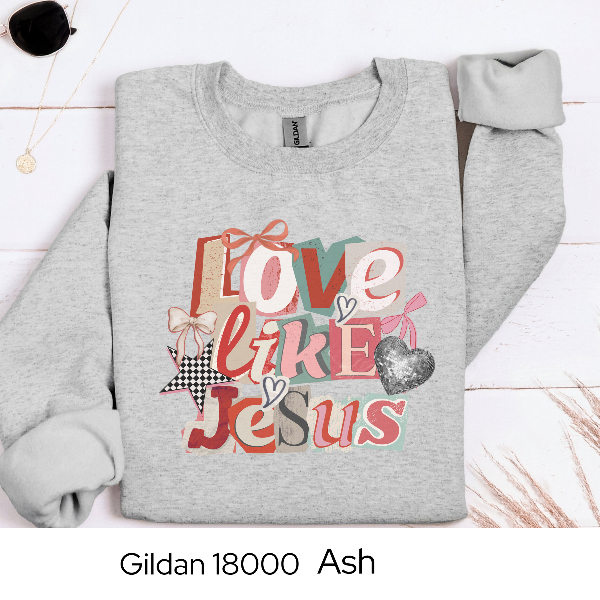 This “Love Like Jesus” crewneck sweatshirt is a reminder to lead with grace, kindness, and compassion every single day. Designed with a trendy collage-style graphic and soft Valentine-inspired colors, it’s perfect for church, casual days, or gifting to someone who loves faith-forward style.