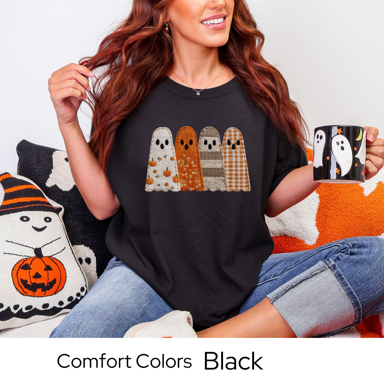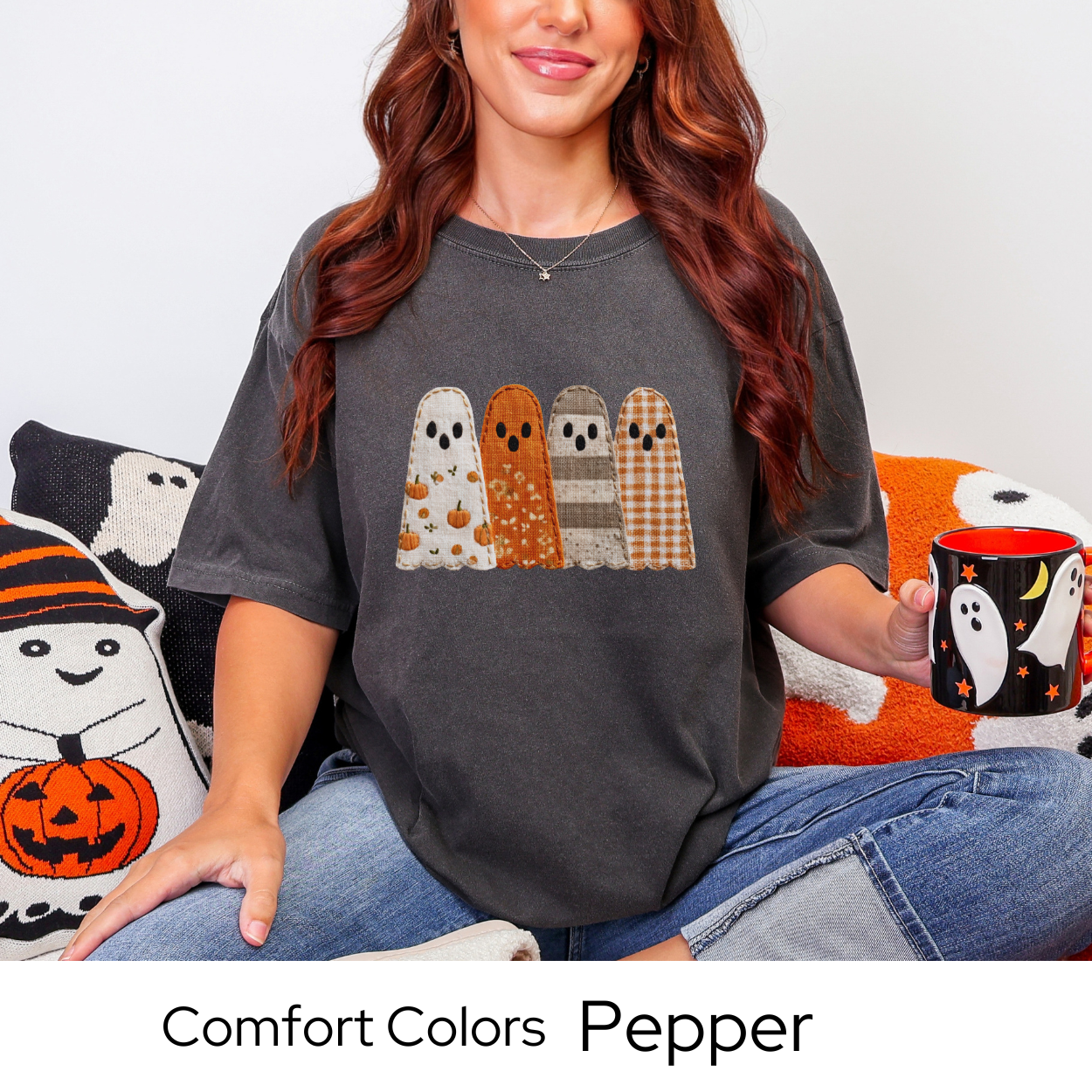Fall Patchwork Ghost T-Shirt, Comfort Colors Halloween Tee, Autumn Ghost Shirt, Cute Spooky Season Top, Fall Graphic Clothing, Faux Embroidery