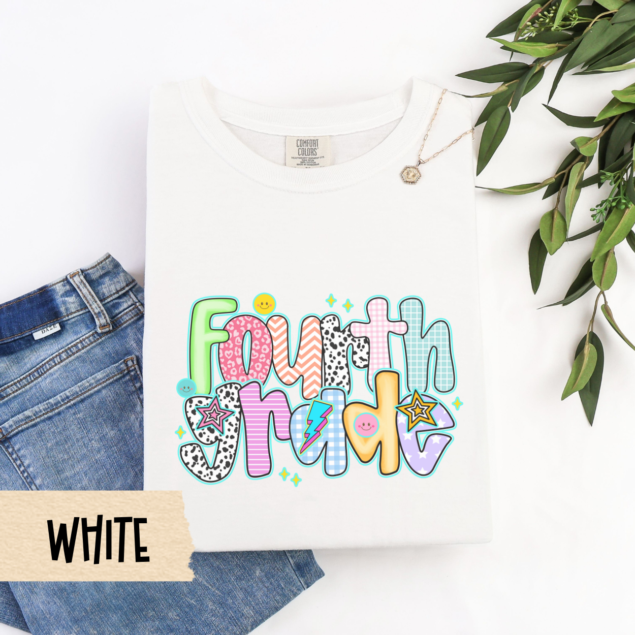 š„ Bright, bold, and ready for fourth grade! This Fourth Grade Teacher Shirt has a playful attitude, packed with stars, patterns, and smiley faces to help you kick off the year with fun and flair. Printed on a buttery-soft Comfort Colors tee!