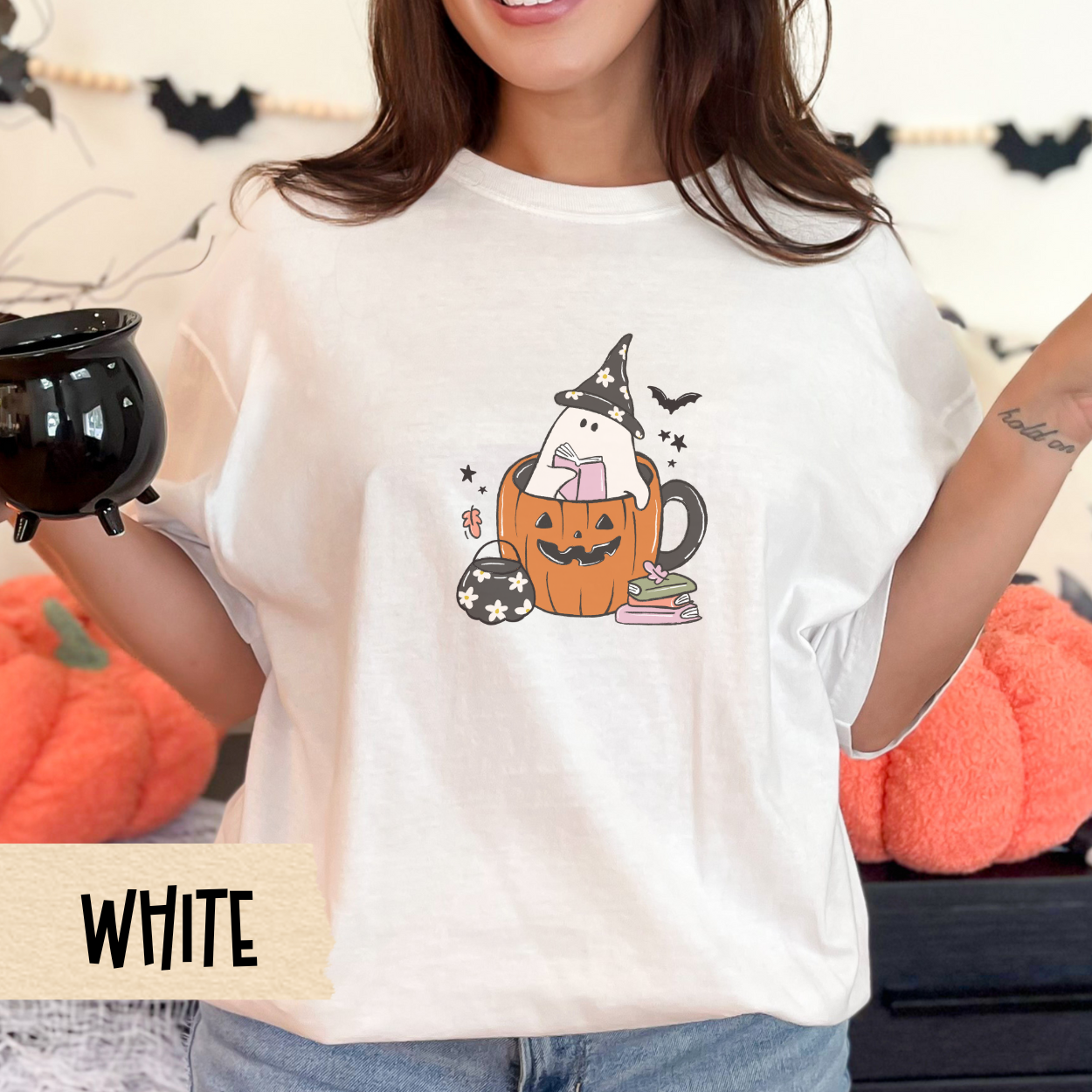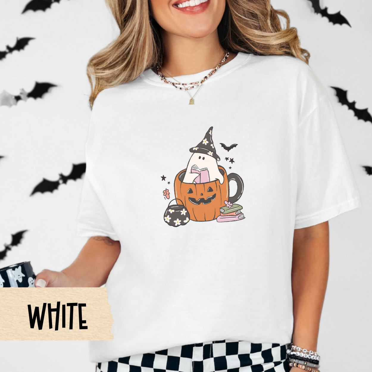 Snuggle into spooky season with this adorable Comfort Colors tee featuring a witchy ghost tucked inside a pumpkin mug—complete with books, bats, and a magical fall vibe. It's the perfect Halloween shirt for cozy girls who love their spooky with a side of soft and sweet.