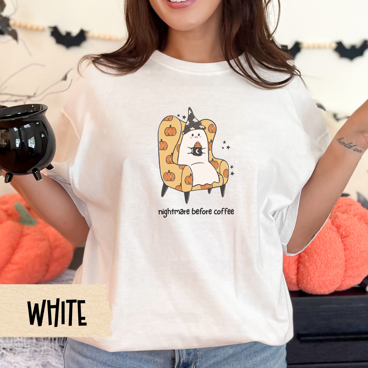 If you're not your cutest self until after caffeine, this Halloween tee is your seasonal spirit animal. Featuring a sleepy ghost in a pumpkin-print chair holding a coffee and rocking a witch hat, this Comfort Colors shirt is made for spooky girls who need their brew before the boo.