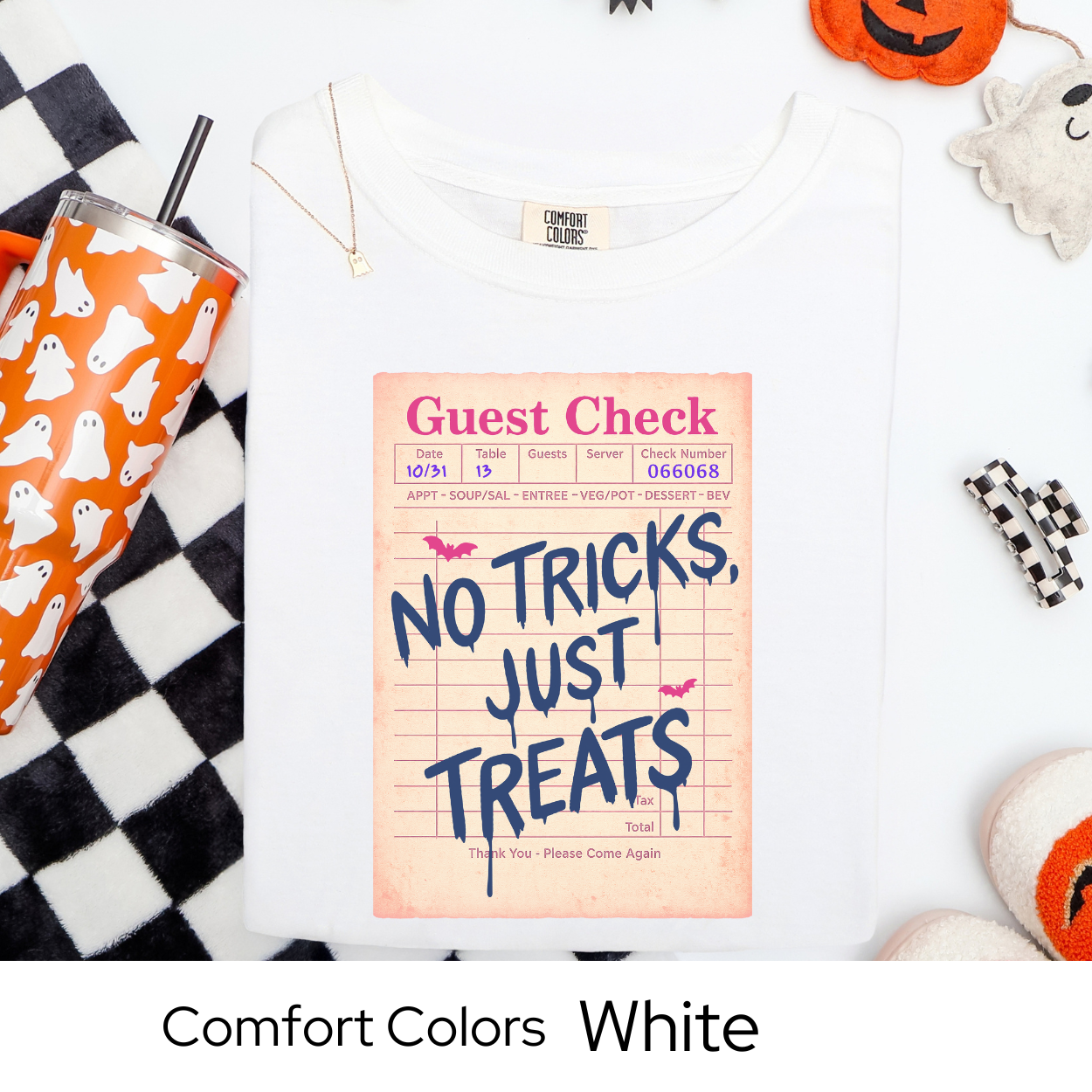 No Tricks Just Treats Shirt, Halloween Guest Check Comfort Colors Tee, Cute Trick or Treat T-Shirt, Retro Fall Graphic Tee