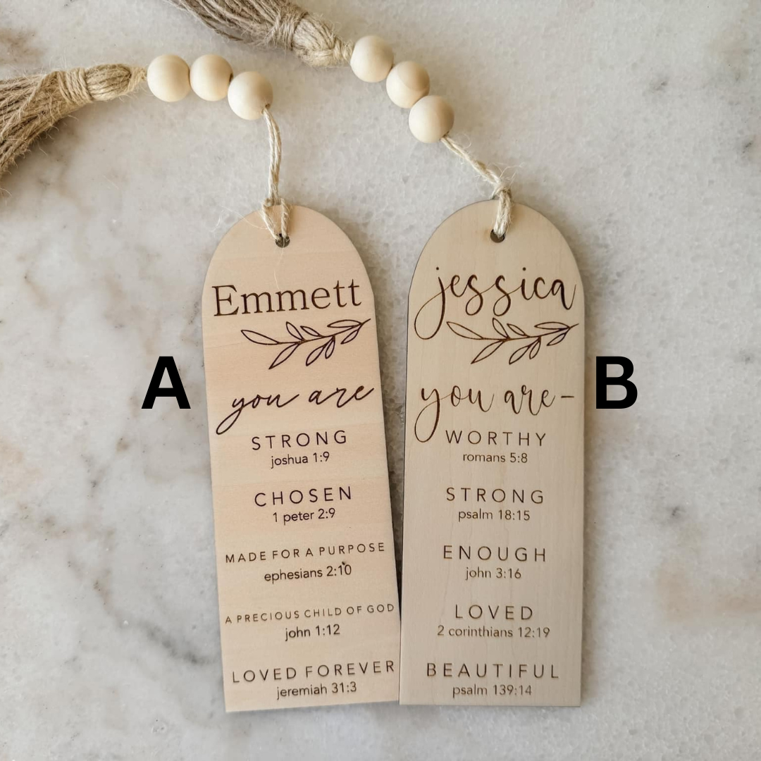 Add a meaningful touch to your Bible study with these beautifully crafted personalized Bible bookmarks, each featuring inspiring scripture affirmations. Choose your favorite Bible verse or affirmation to be engraved alongside a name of your choice, making this a truly unique and uplifting gift for yourself or a loved one. Perfect for daily inspiration, these bookmarks are designed to keep you encouraged and focused on faith every time you open your Bible. Ideal for birthdays, graduations, or simply as a thoughtful gift to support someone’s spiritual journey.