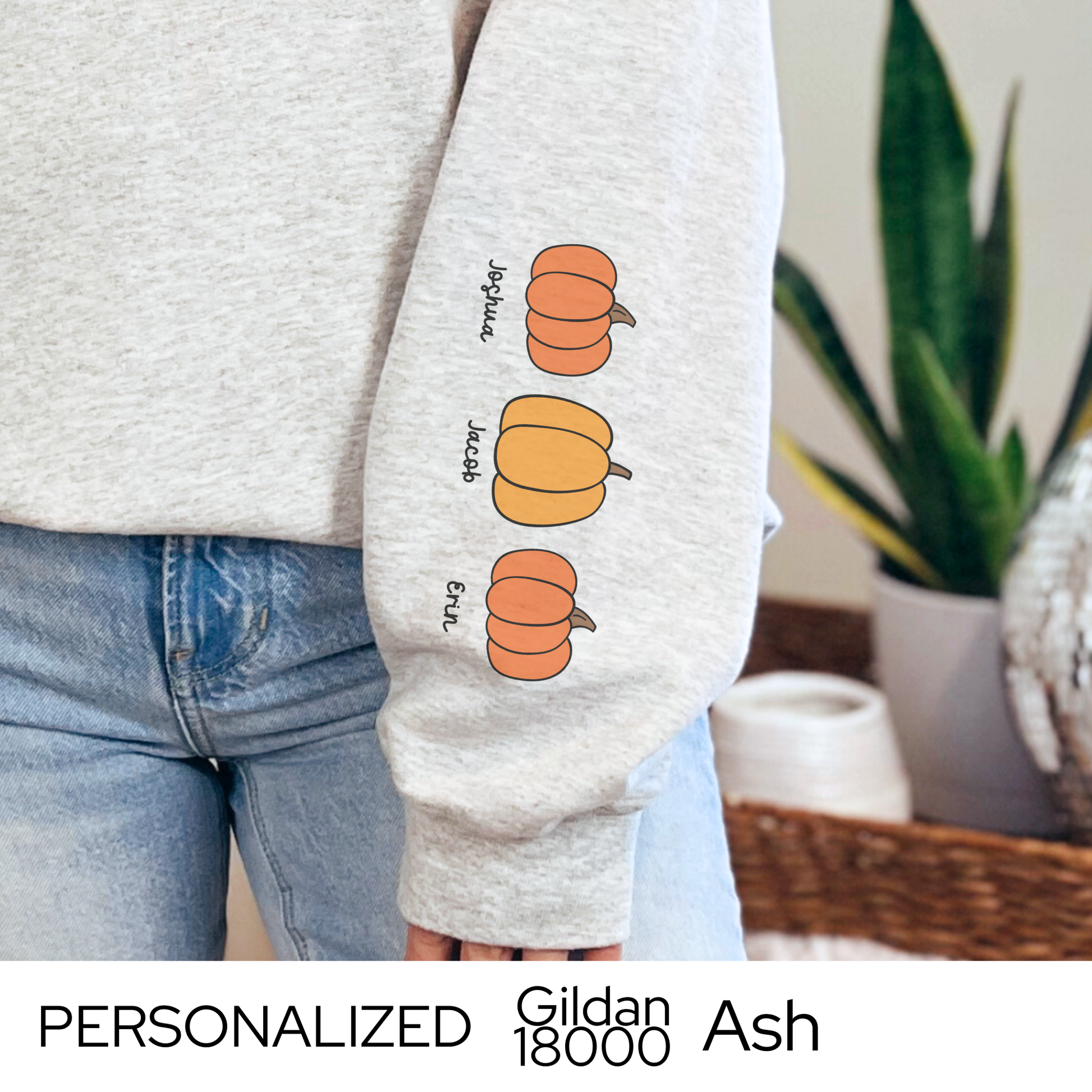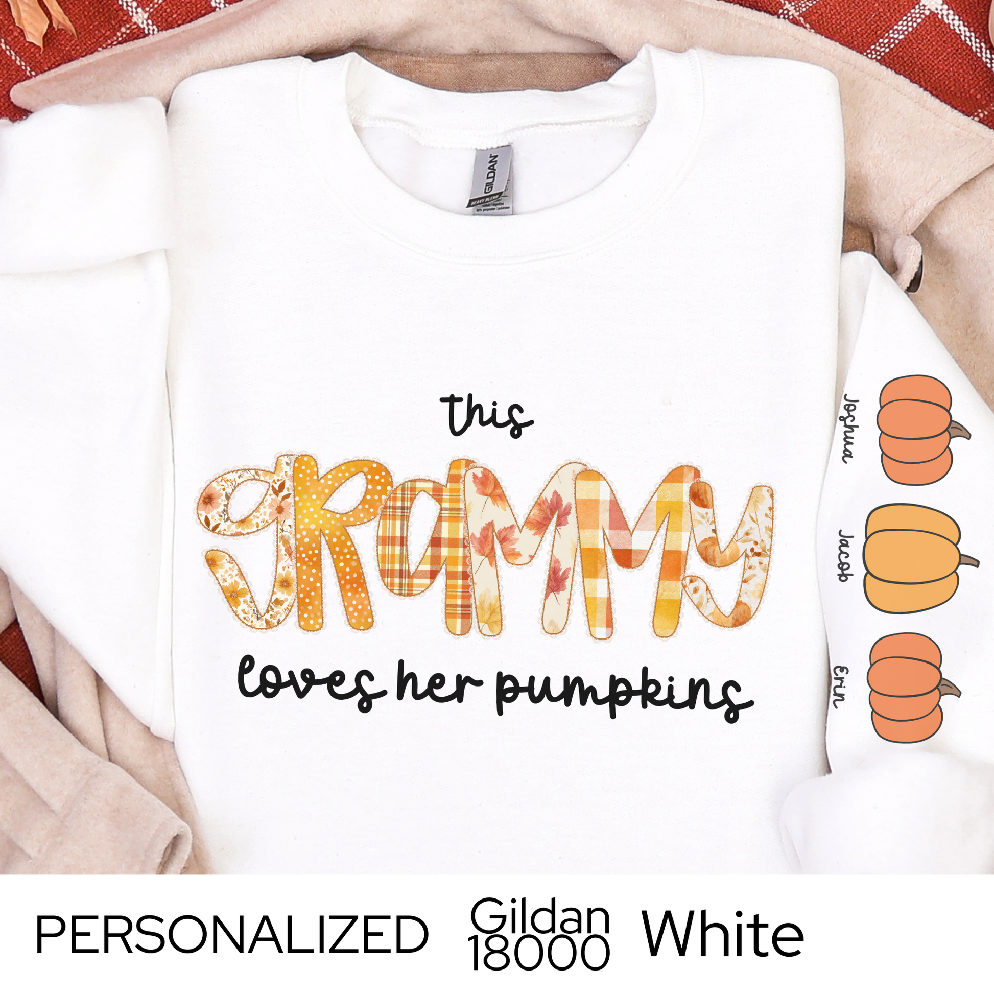 Celebrate autumn in cozy style with this custom family sweatshirt! The front reads āThis [Grandma name] loves her pumpkinsā and the sleeve features personalized pumpkins with each grandchildās name. Itās a heartfelt way to keep your little pumpkins close, whether at Thanksgiving dinner or all season long.