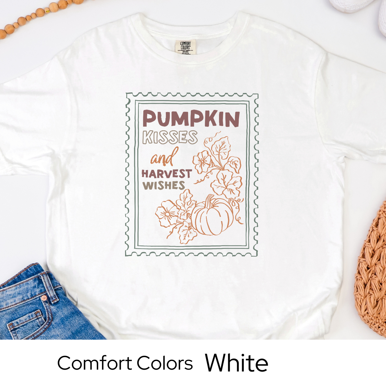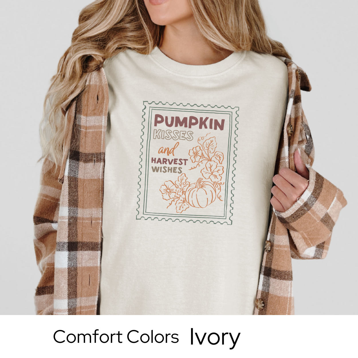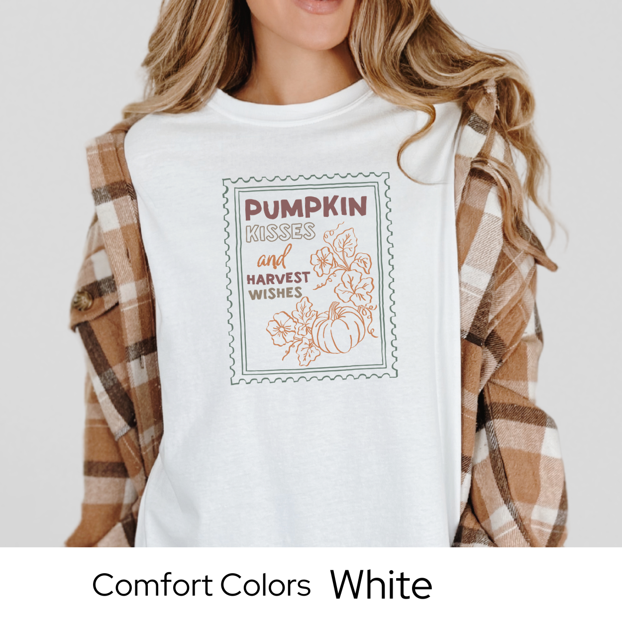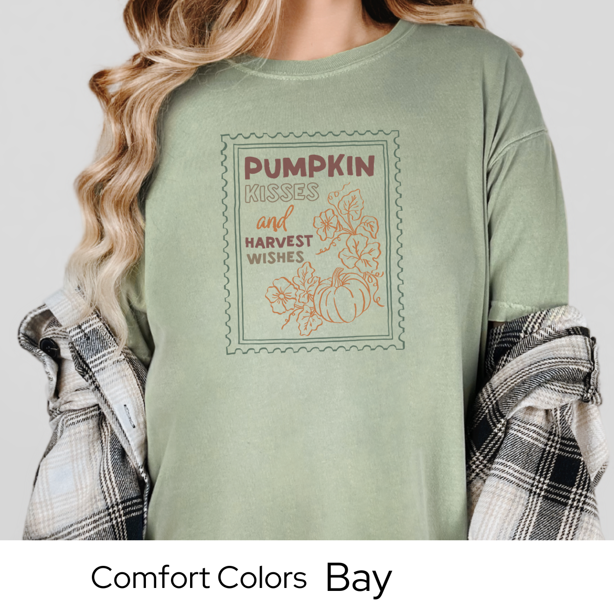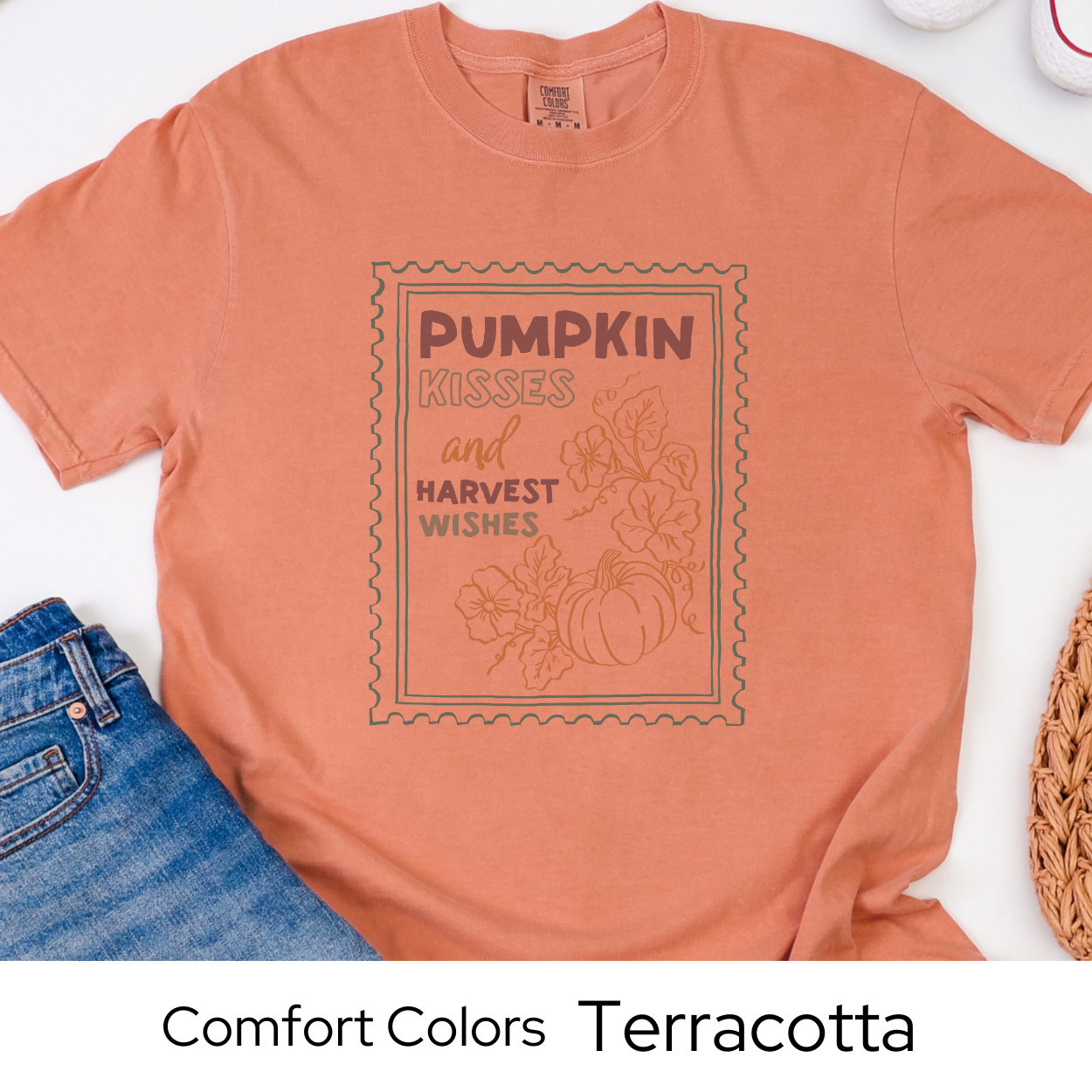 Pumpkin Kisses Fall Shirt, Comfort Colors Tee, Harvest Season Graphic T-Shirt, Retro Stamp Design, Cute Autumn Shirt for Women, Cozy Top