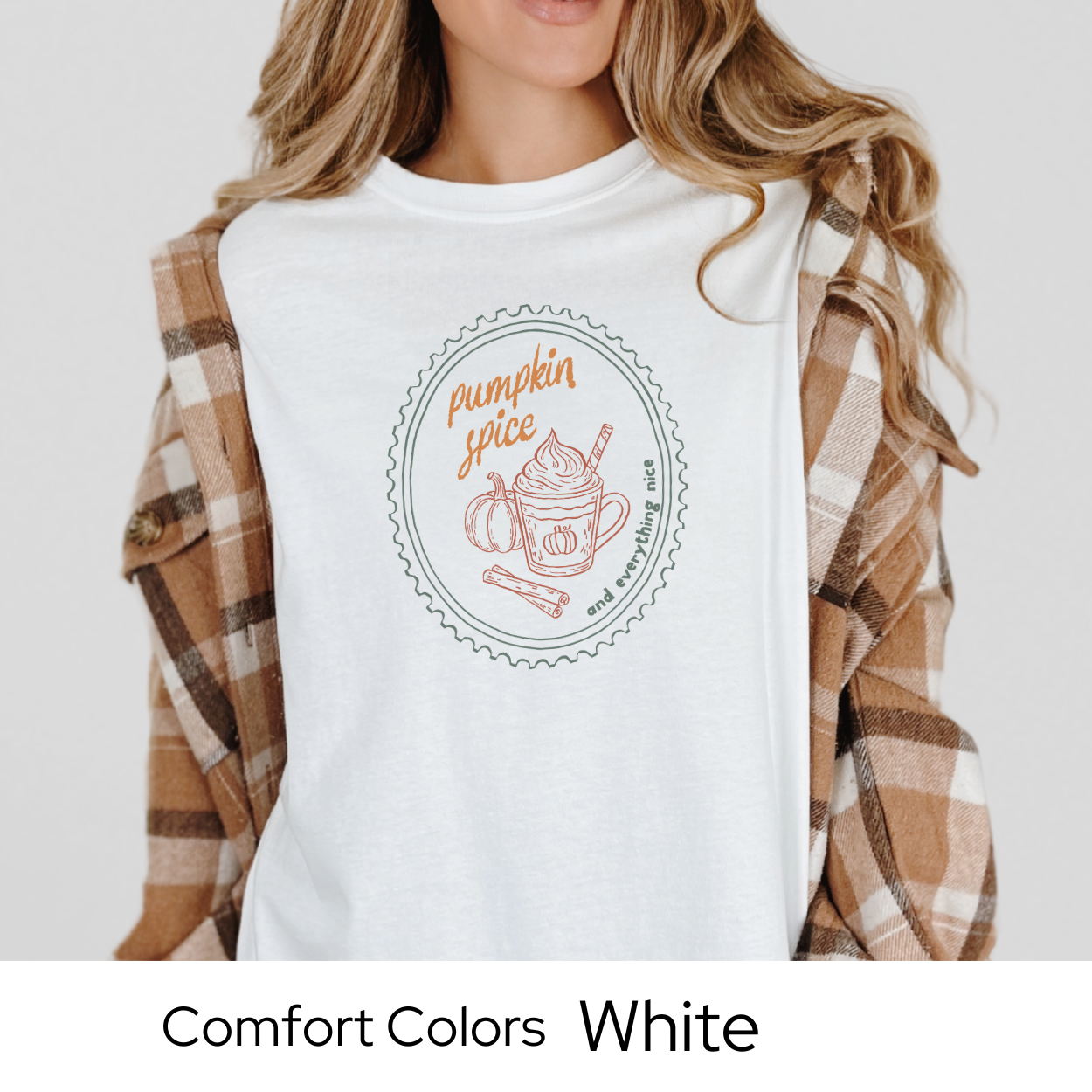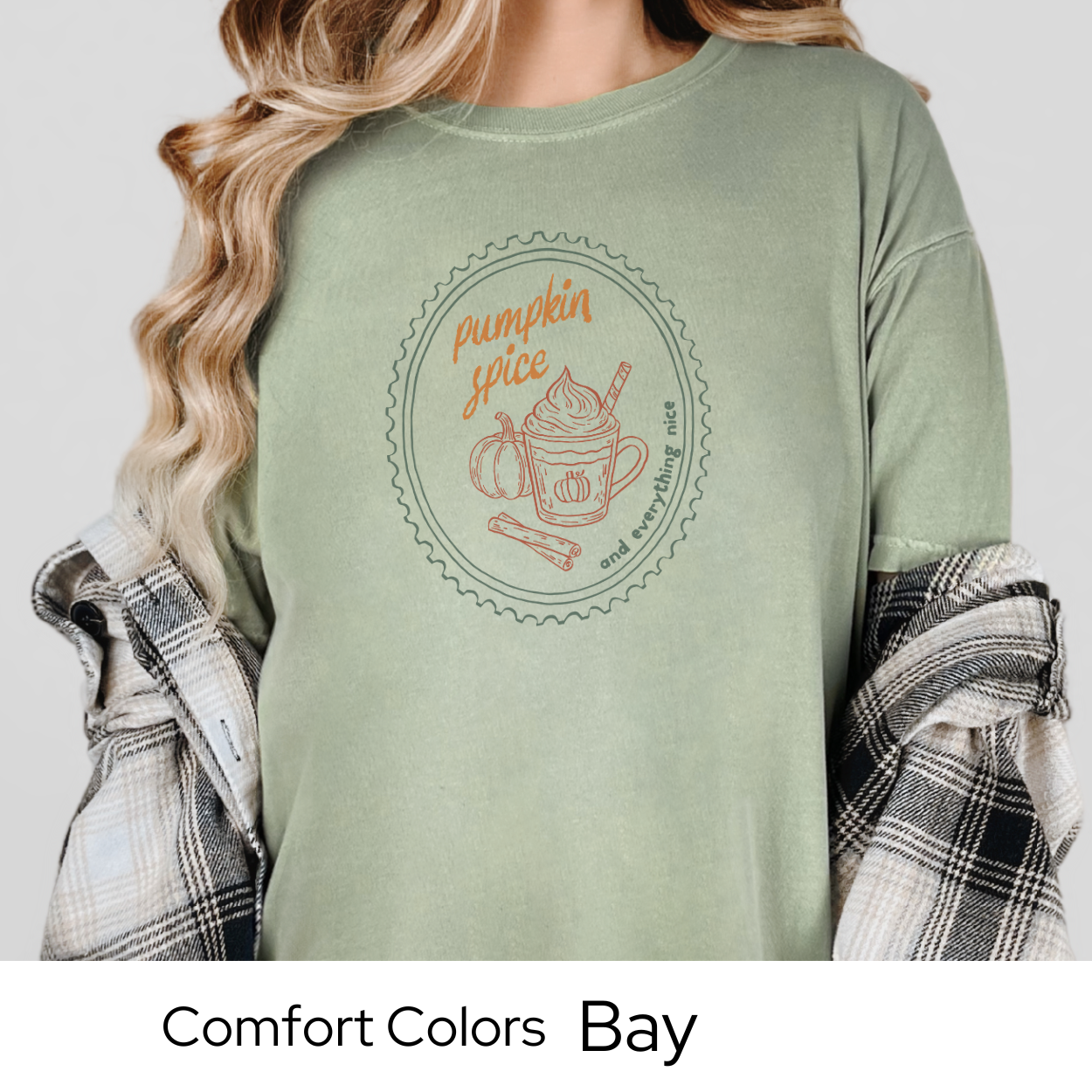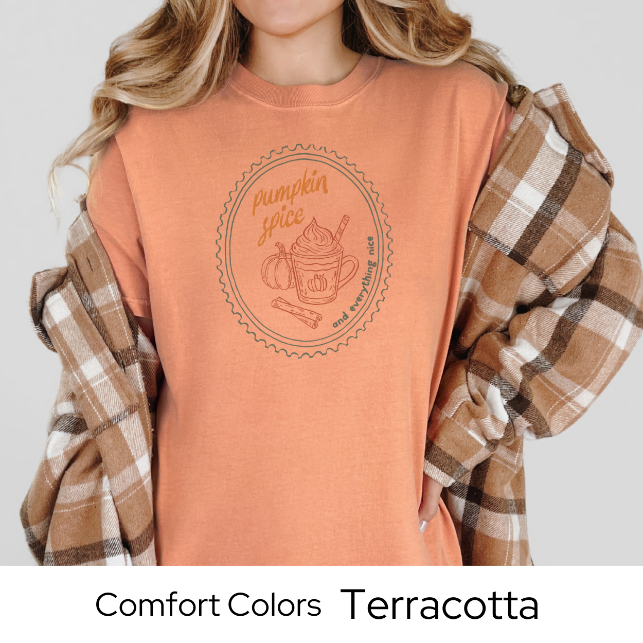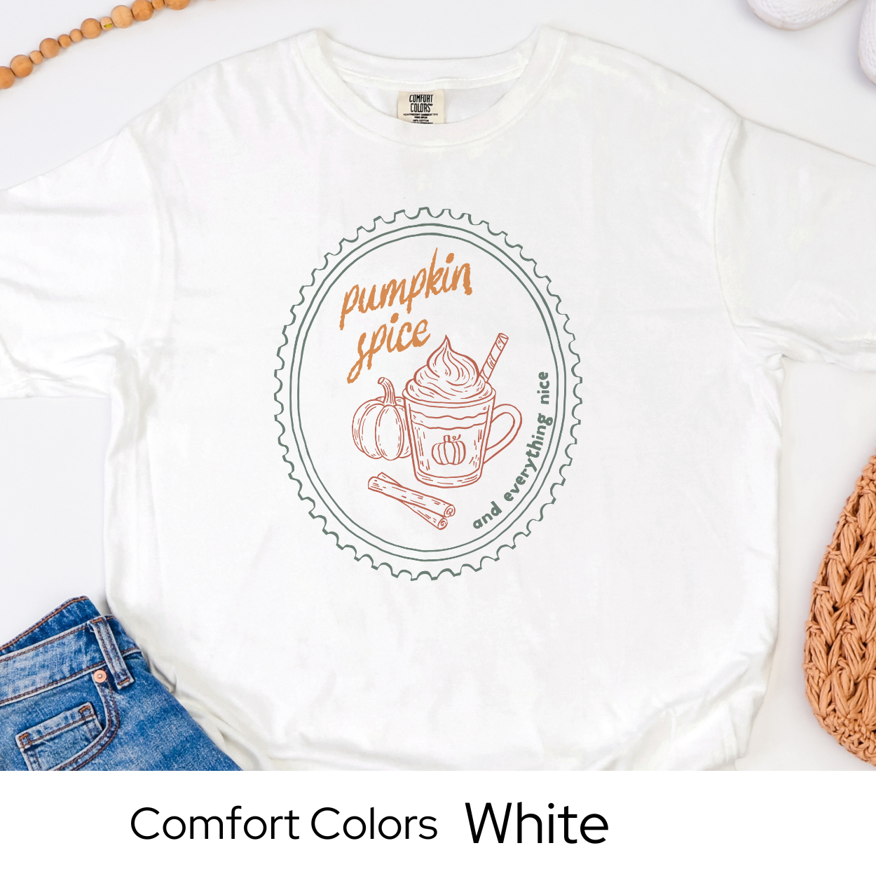 Sip in style this season with our Pumpkin Spice and Everything Nice fall shirt! Featuring a cozy stamp-style graphic of a pumpkin spice latte, this Comfort Colors tee is made for coffee lovers, PSL season, and all things autumn.