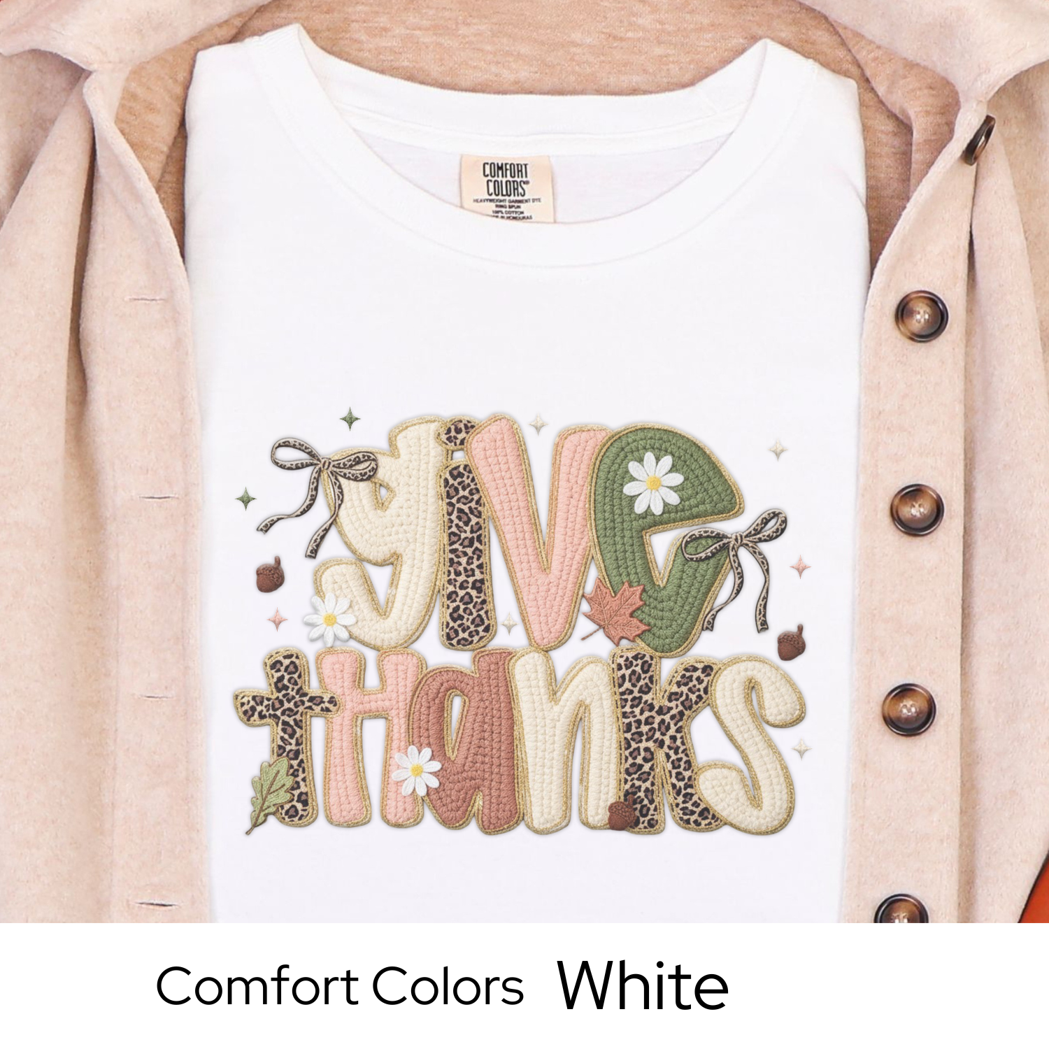 Bring cozy fall vibes to your wardrobe with this Give Thanks Comfort Colors shirt! Featuring a soft neutral palette with hints of leopard and stitched-style letters, this tee is perfect for Thanksgiving, Friendsgiving, or any autumn day when you want to feel festive and grateful. This is a printed design made to look like faux yarn embroidery—not an actual 3D texture, but it gives that same cozy look you love.