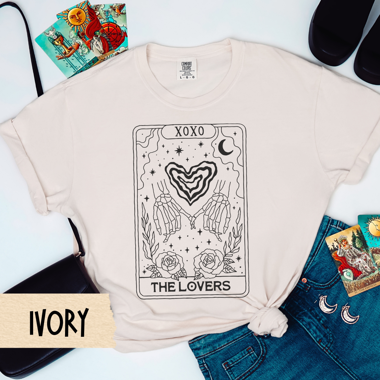 Till death (and beyond) do us part. “The Lovers” tarot tee is perfect for spooky soulmates, gothic babes in love, and hopeless romantics with a dark side. The design features skeleton hands forming a heart, with stars, roses, and all the witchy vibes.