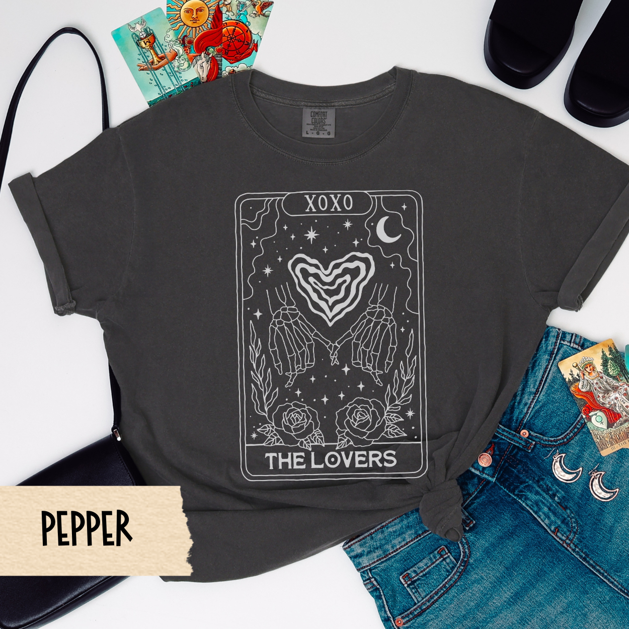 Till death (and beyond) do us part. “The Lovers” tarot tee is perfect for spooky soulmates, gothic babes in love, and hopeless romantics with a dark side. The design features skeleton hands forming a heart, with stars, roses, and all the witchy vibes. Printed on a comfy Comfort Colors 1717 tee, it’s made for cuddles, spell work, or date night in the graveyard. 💀 Product Highlights: Comfort Colors 1717 tee – soft & garment-dyed 100% ring-spun cotton, pre-shrunk Unisex sizing – size up for that oversized, lived-in look DTG printed with eco-friendly inks Skeleton lovers tarot card design with celestial details 💌 Great For: Alternative couples Spooky weddings & engagements Gothic Valentine's Day looks Tarot and astrology lovers Halloween with your boo 🧼 Care Instructions: Wash inside out cold, tumble dry low, don’t iron design directly