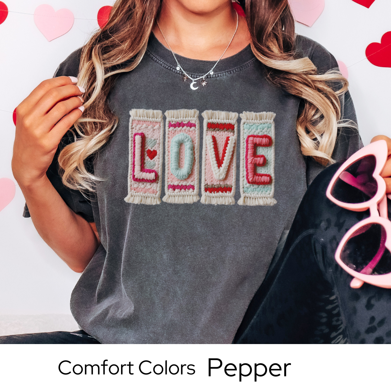 Valentines Day Graphic T Shirt, Faux Yarn Love Tee, Patchwork Valentine Shirt, Cozy Valentine Outfit Comfort Colors 1717